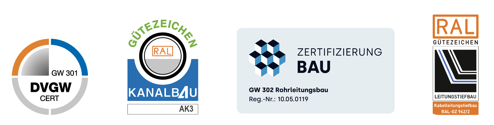 Zertifiziert mit dem Gütezeichen Kanalbau der Gruppe AK 3 bieten wir eine qualifizierte Verlegung und Prüfung von sämtlichen Leitungen und Kanälen.